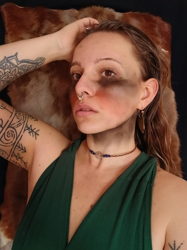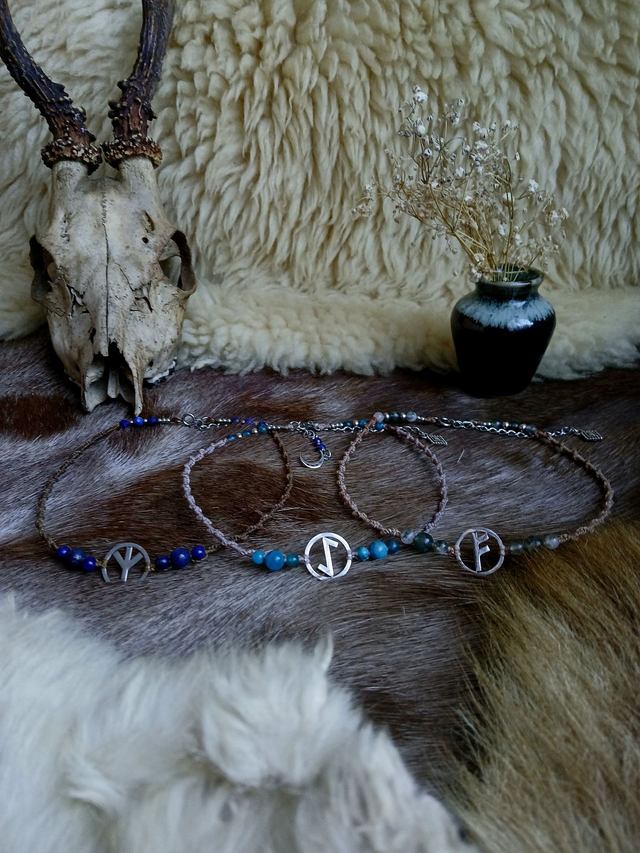 Cette trilogie de ras-de-cou runique sont réalisés avec des pierres naturelles, des perles décoratives en alliage de zinc, la rune est en acier inoxydable, ainsi que des apprêts en acier inoxydable (fermoir à ressort + chaîne).