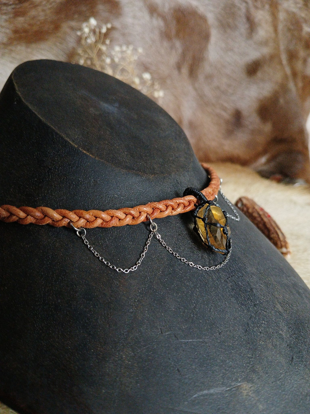 Citrine naturelle, cuir recyclé (tressé à la main) et chaîne et anneaux en acier inoxydable