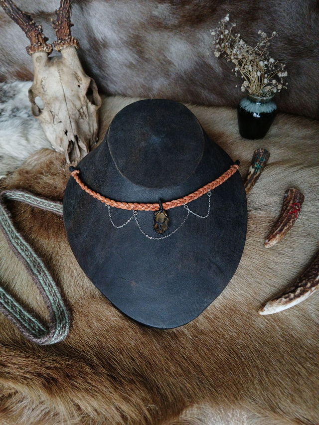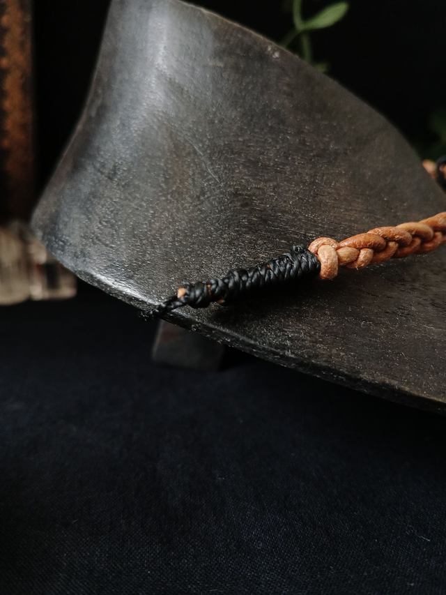 Le cuir enserre, les chaînes rappellent les entraves que la lumière brise. Ce bijou est un hommage à celles qui transforment la rudesse en éclat.